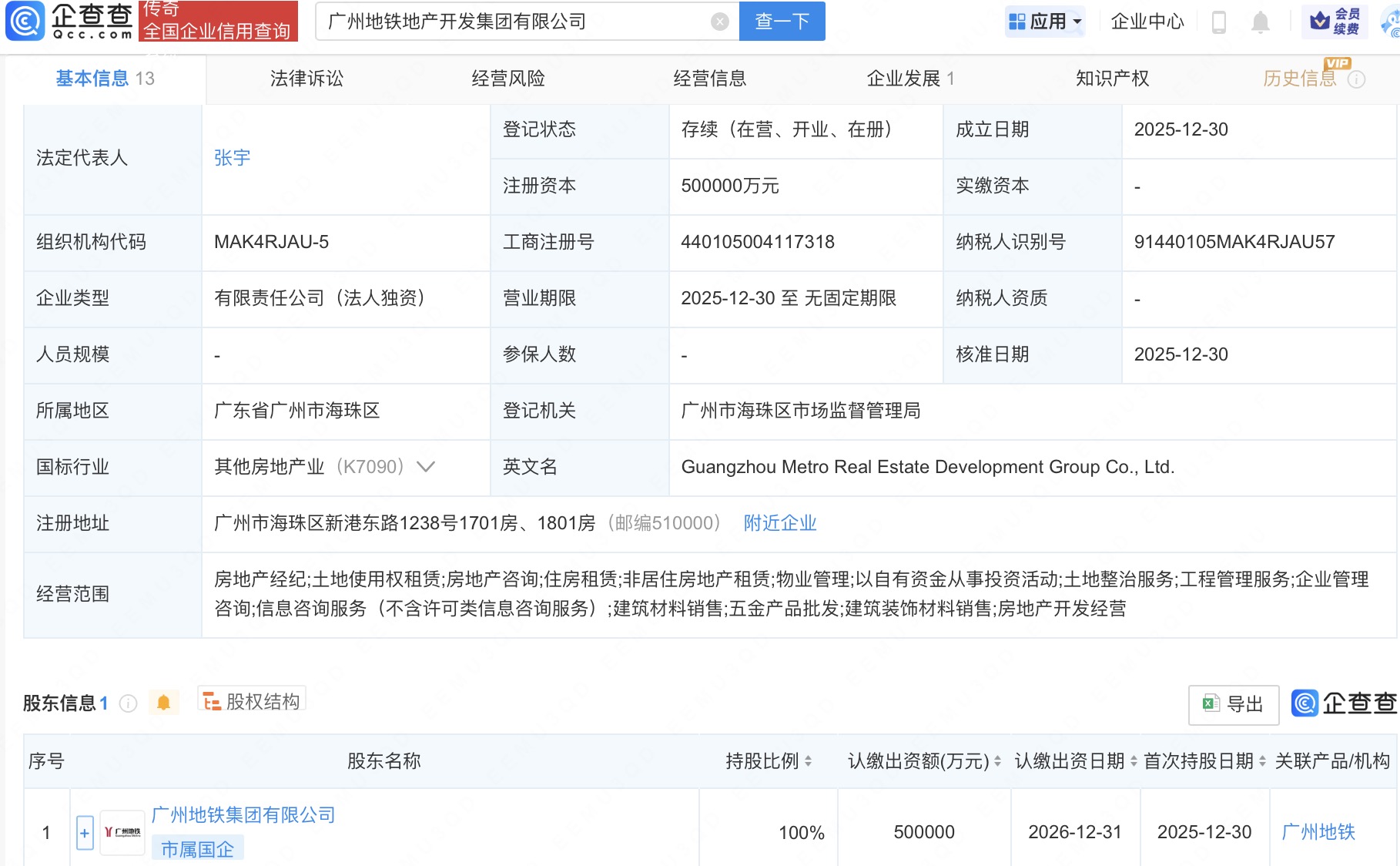 近日,广州地铁地产开发集团有限公司成立,法定代表人为张宇配资炒股就找配资,注册资本50亿人民币,经营范围包括房地产经纪、土地使用权租赁、房地产咨询、住房租赁等。企查查股权穿透显示,该公司由广州地铁集团有限公司全资持股。