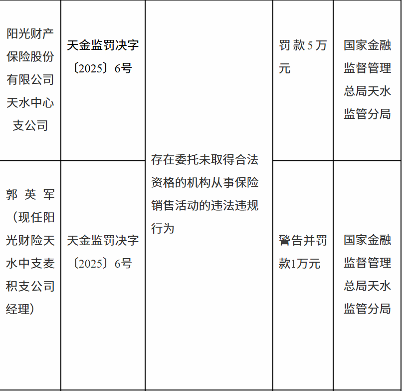 1月5日,国家金融监督管理总局天水监管分局行政处罚信息公开表显示,阳光财产保险股份有限公司天水中心支公司因存在委托未取得合法资格的机构从事保险销售活动的违法违规行为被被罚款5万元配资app,郭某军被警告并罚款1万元。